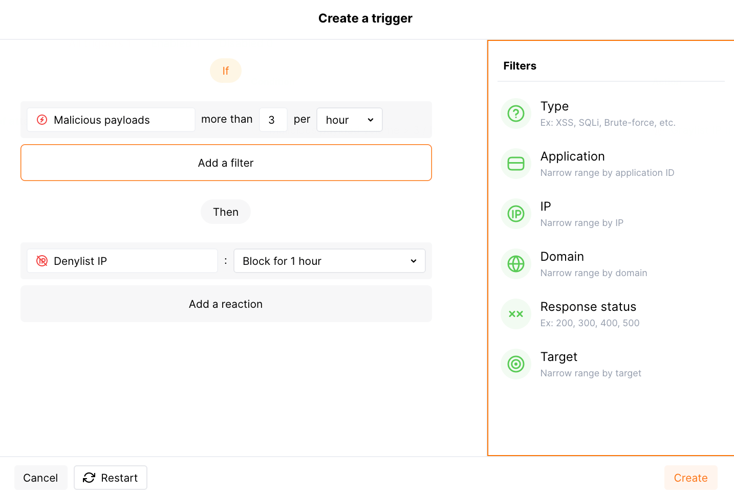 Block for 1 hourtrigger reaction. Wallarm will put origin IP to the denylist after the threshold is exceeded and block all further requests from it.Note that even if the bot IP is placed into the denylist by multi-attack protection, by default, Wallarm collects and displays statistics regarding blocked requests originating from it.