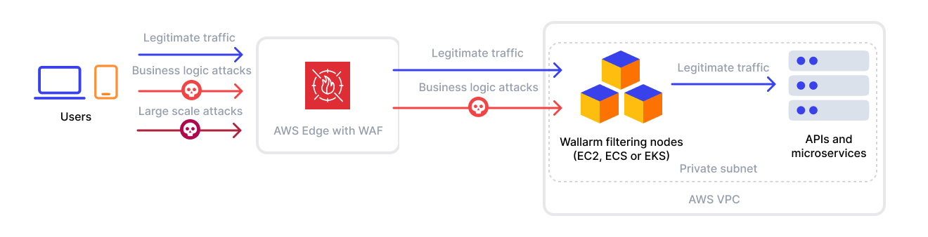 Clean traffic then flows to Wallarm nodes running in ECS, EKS, or EC2. Acting as a smart proxy or ingress controller, Wallarm performs deep API inspection, detecting logic flaws, multi-step attacks, and anomalous patterns. Only validated traffic is forwarded to application services.
