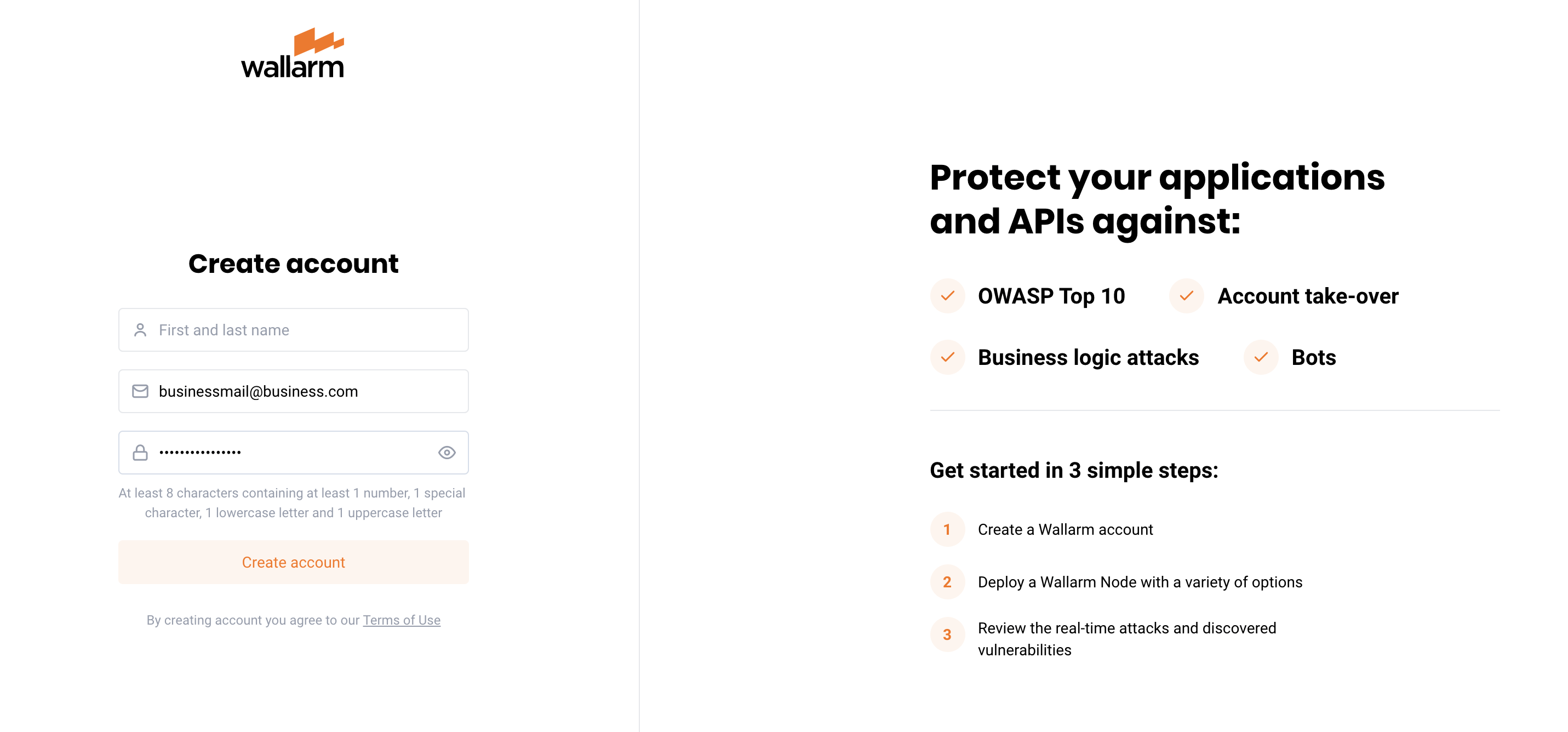 Fill in and confirm the registration form in Wallarm Console in the US Cloud or EU Cloud, or ME Cloud.