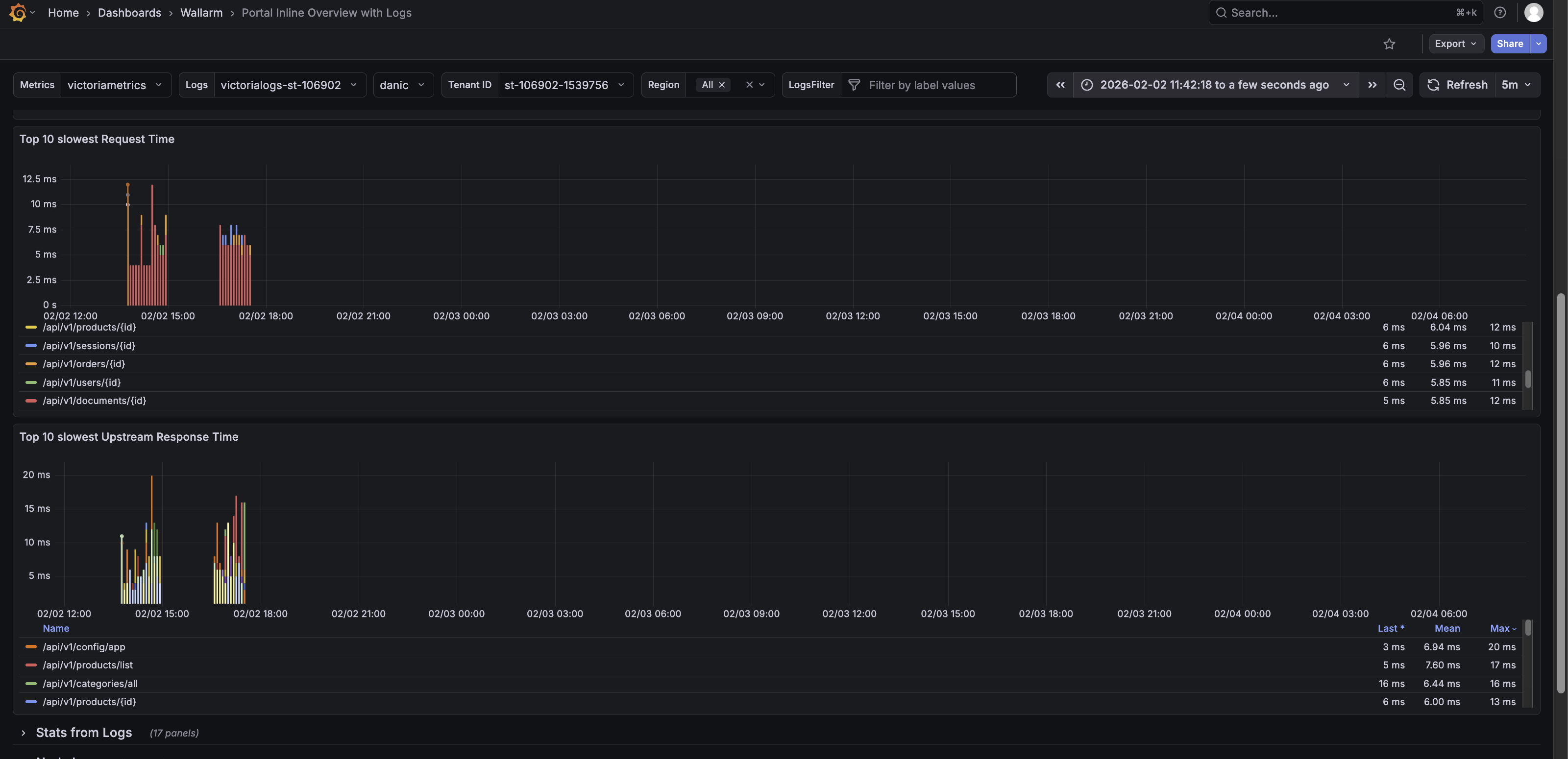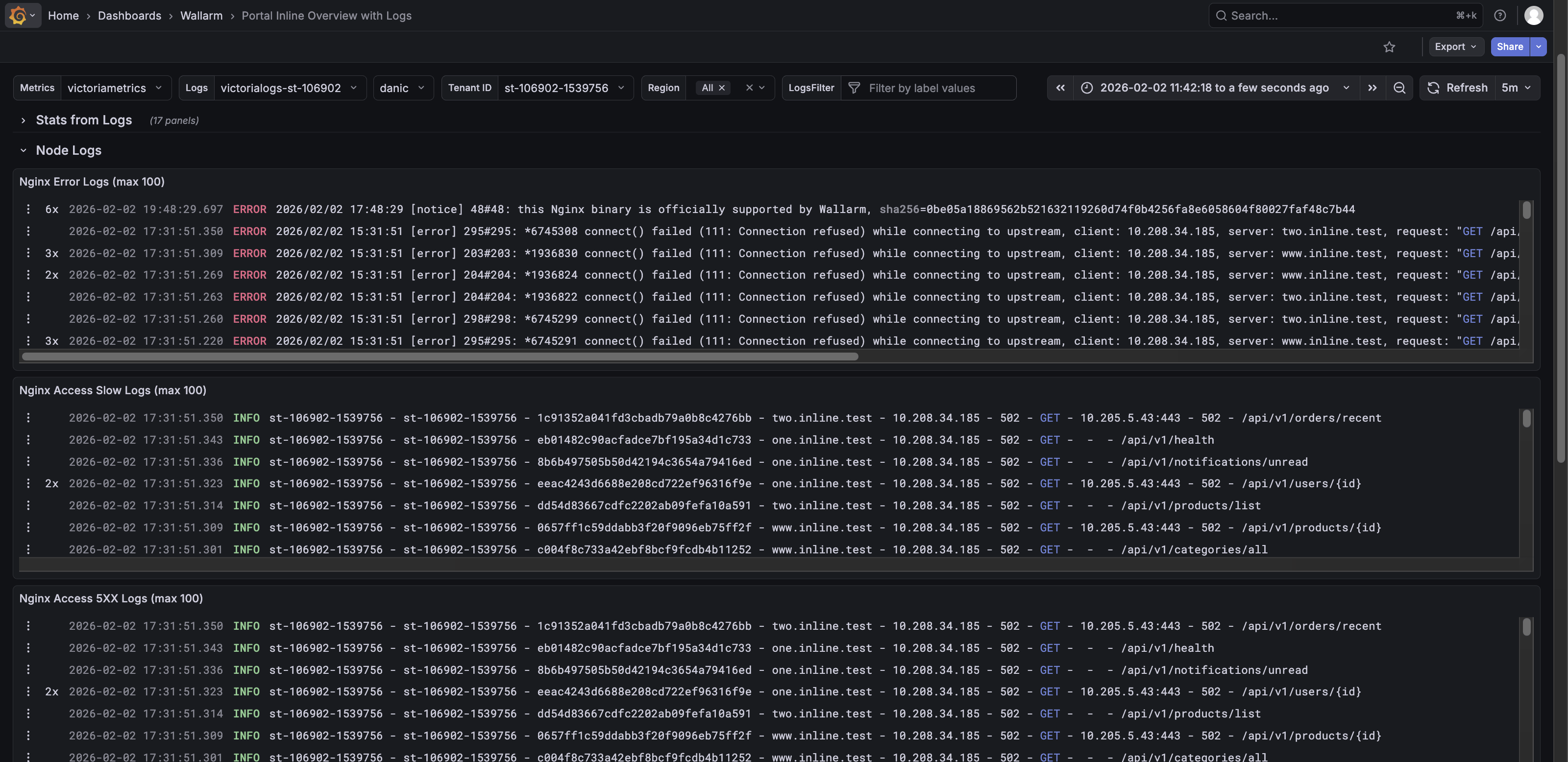 To quickly view NGINX error and access logs without additional metrics, use the dedicated Portal Inline NGINX Logs dashboard.