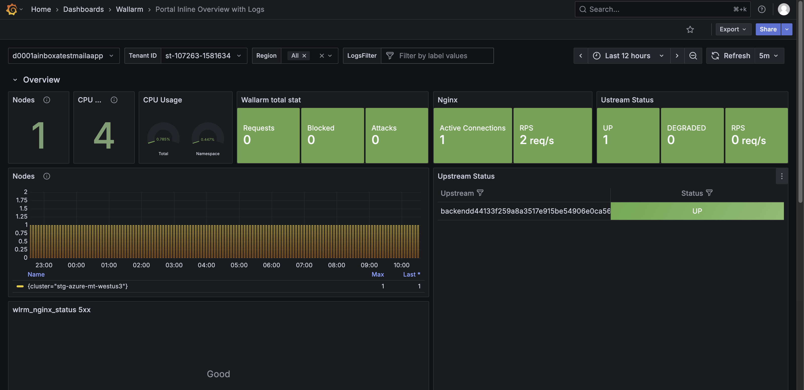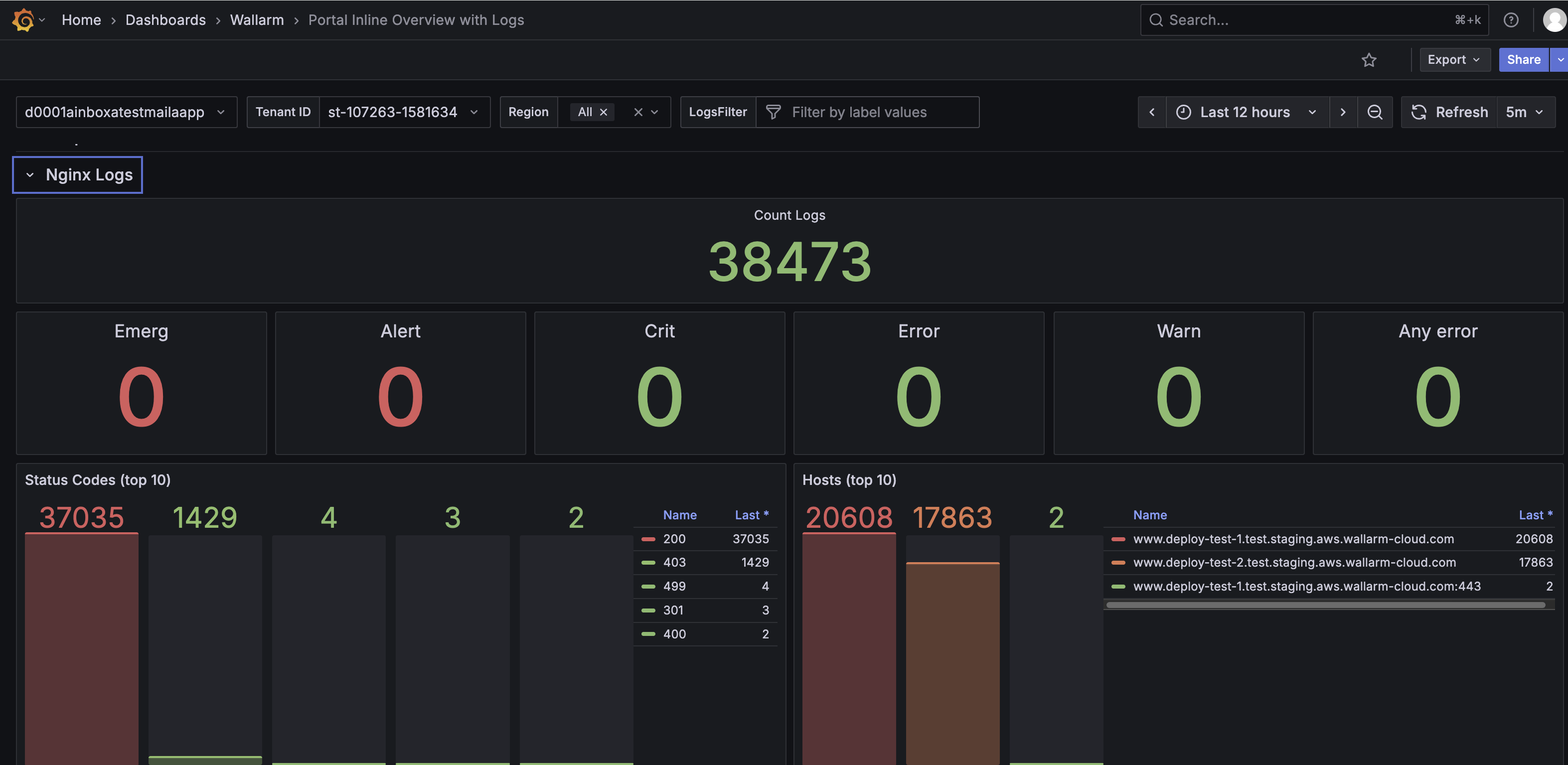 Unlike the dedicated Portal Inline NGINX Logs dashboard, which shows only NGINX error and access logs, the Node Logs row presents these logs alongside other key node and Wallarm metrics. This way you can monitor NGINX traffic in context, correlate errors with overall performance, and detect potential issues more efficiently.
