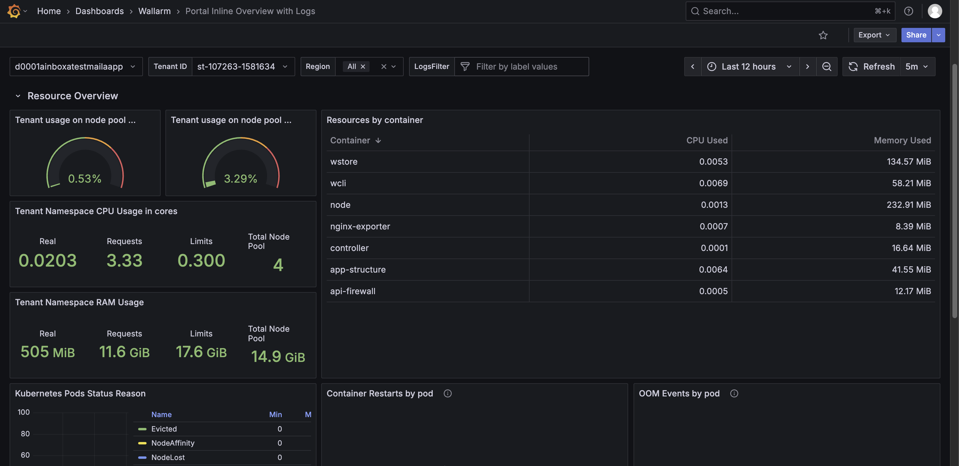 • Tenant Namespace RAM Usage โ€“ Shows RAM usage per namespace, including real usage, requested resources, limits, and total Node pool memory.