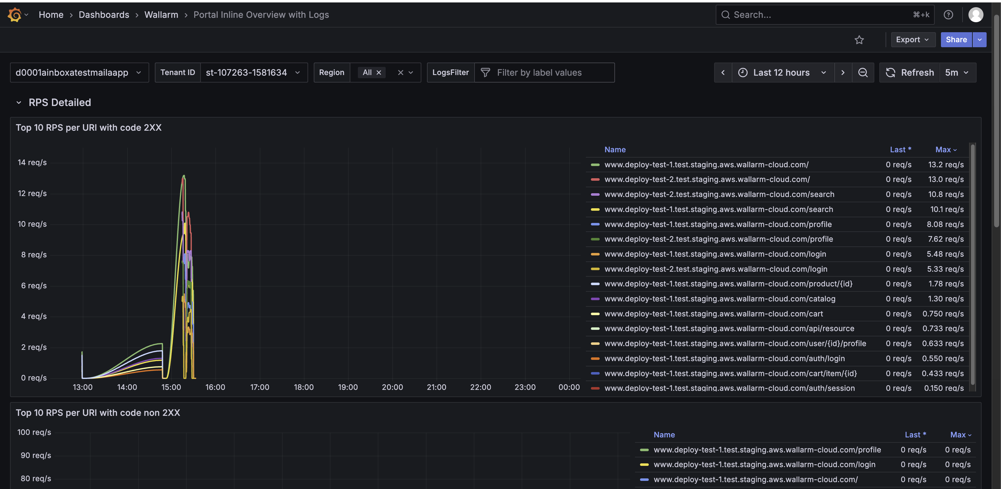 • Top 10 RPS per URI with code non-2XX โ€“ Shows URIs generating client or server errors (any HTTP code other than 2XX).