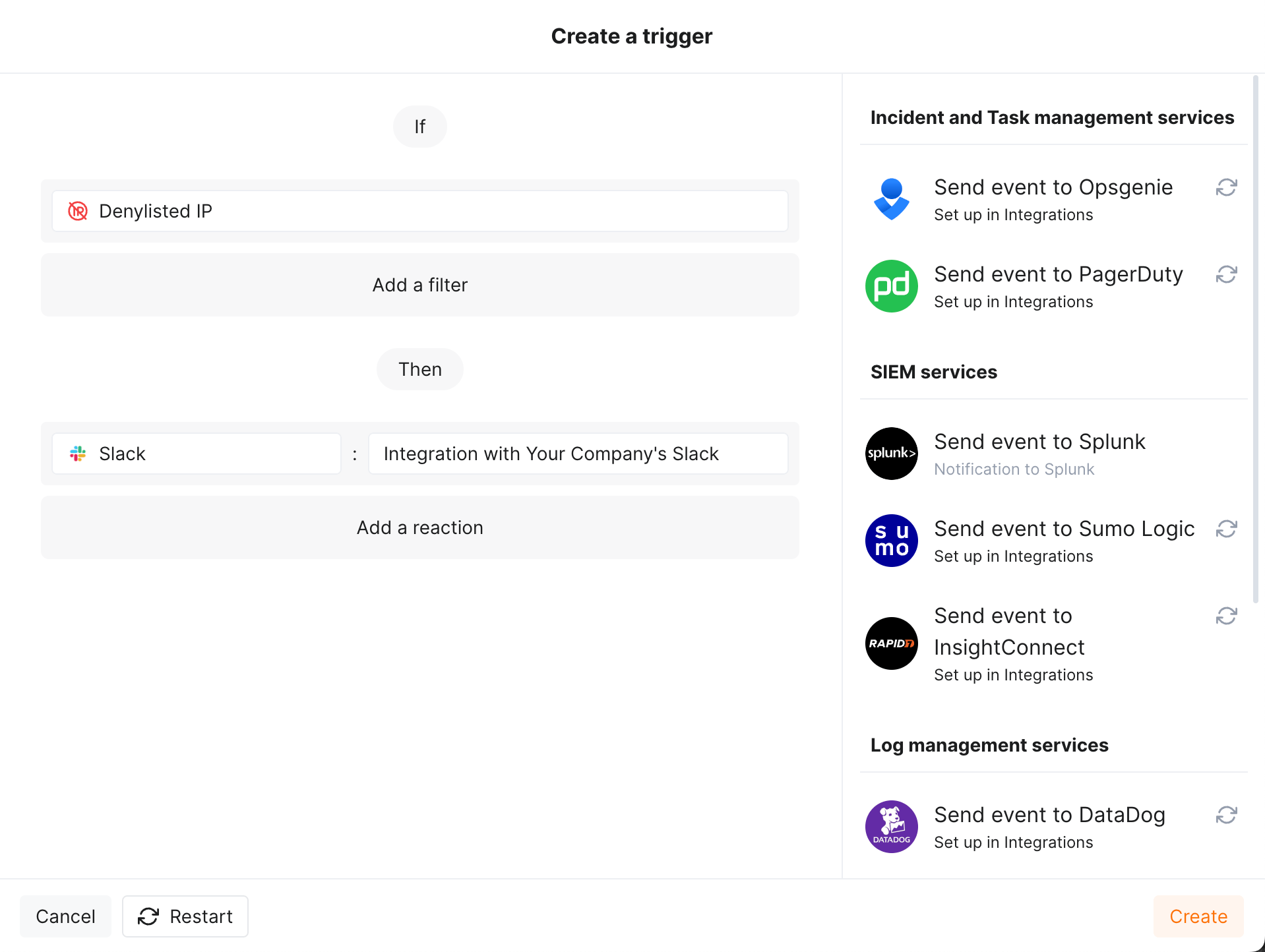 You can get notifications about newly denylisted IPs via the messengers or SIEM systems you use every day. To enable notifications, in Triggers section, configure one or several triggers with the Denylisted IP condition, e.g.:
