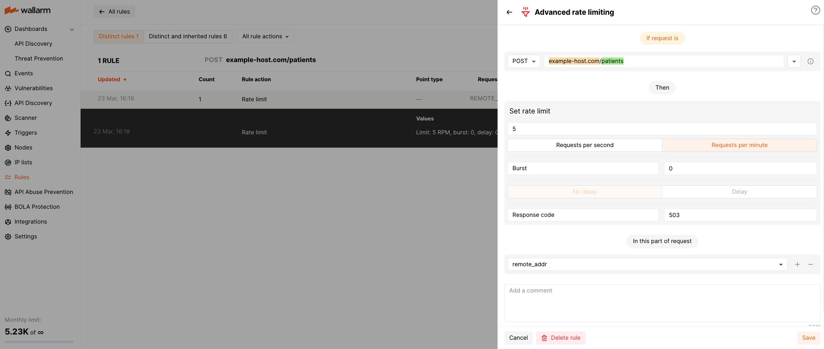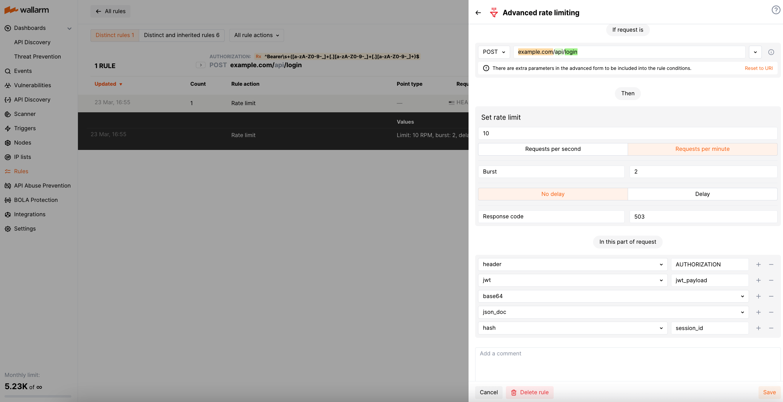 • If you have multiple Wallarm nodes and the incoming traffic on each node meets the rate limit rule, they are limited independently.