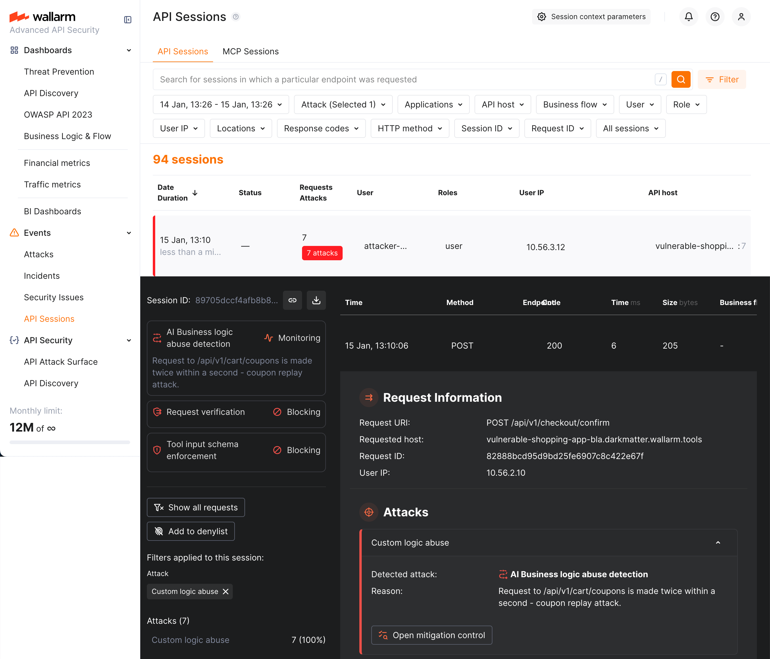 The business logic abuse is not detected by default and requires configuration. Once configured, Wallarm utilizes LLM-based analysis to detect any anomalies in API Sessions: