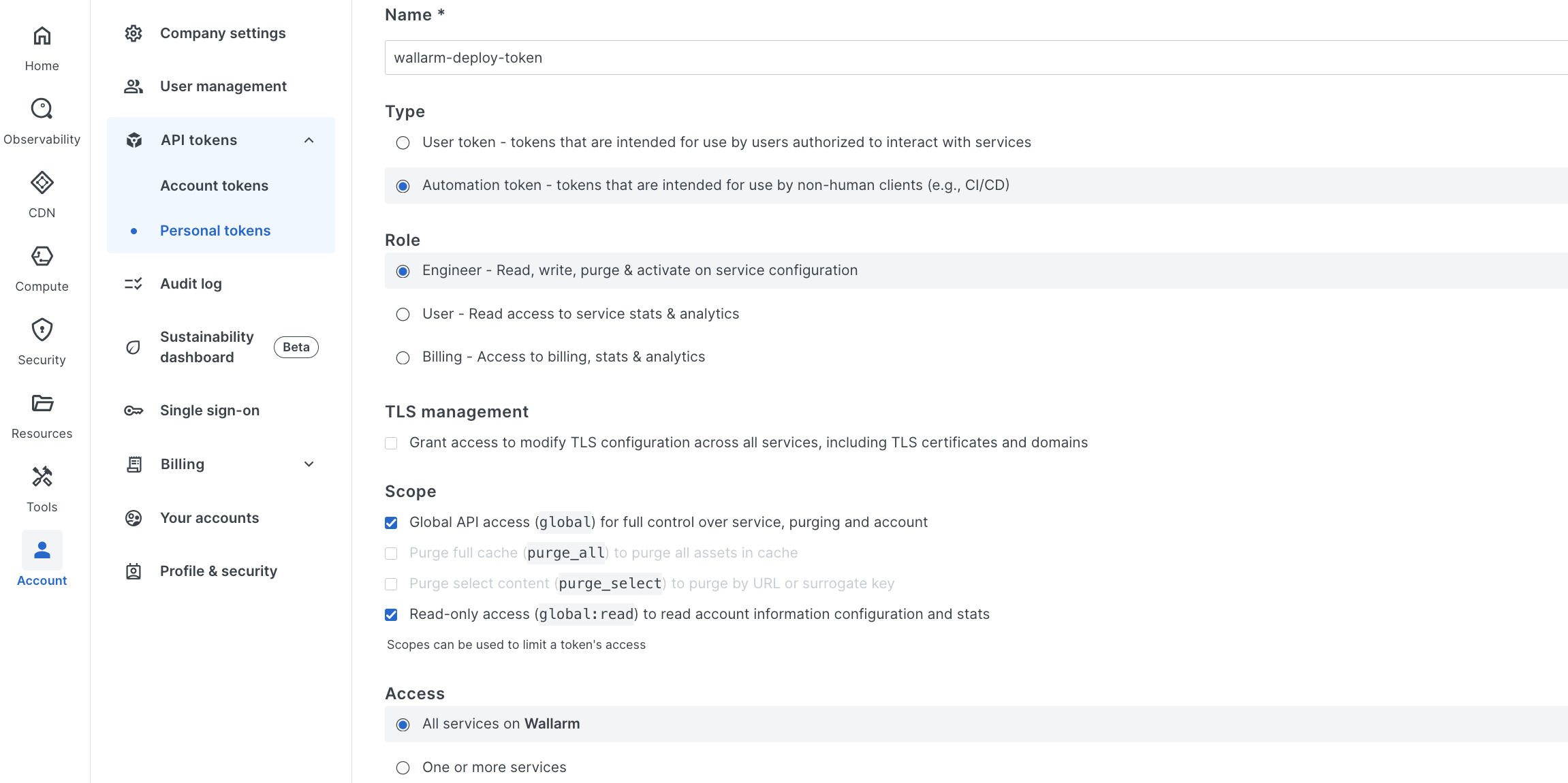 Go to Fastly UI → Account → API tokens → Personal tokens → Create token: