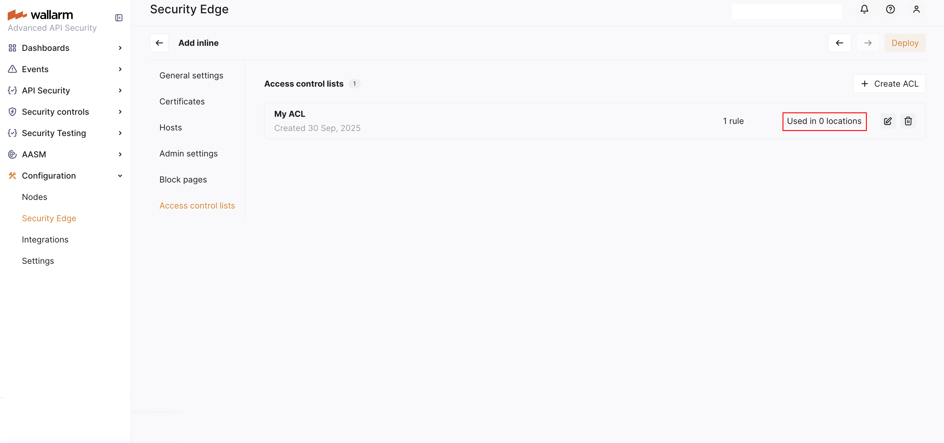 1. Go to Wallarm Console โ†’ Security Edge โ†’ Inline โ†’ Configure โ†’ Access control lists and click Create ACL.
