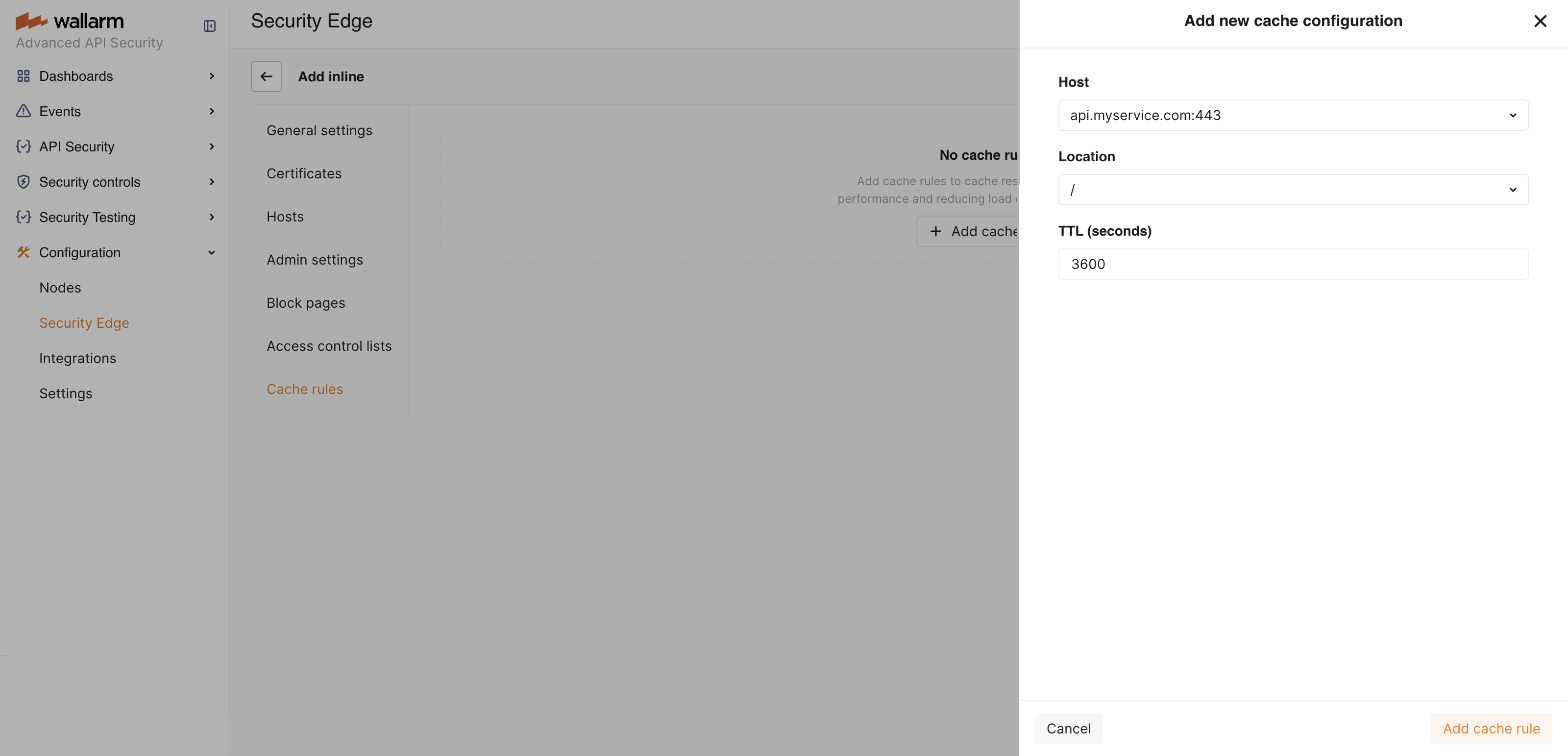 1. Go to Wallarm Console โ†’ Security Edge โ†’ Inline โ†’ Configure โ†’ Cache rules.